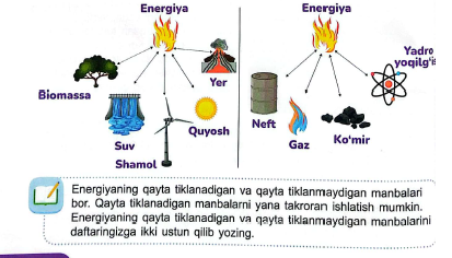 Motorning ishlab turishi, transport vositalarining yurishi, uylarning isishi, zavod va fabrikalarning faoliyat yuritishi uchun quvvat, ya'ni energiya kerak. Energiyaning turli manbalari bor: quyosh energiyasi, shamol energiyasi, yadro energiyasi, foydali qazilmalardan olinadigan energiya va hokazo. Foydali qazilmalardan energiya olish uchun ular yoqiladi. Ko'mir va tabiiy gazni hech qanday ishlov bermasdan yoqish mumkin bo'lsa, neftni esa avval benzin, mazut, dizel yoqilg'isi yoki kerosinga aylantirib olish kerak.