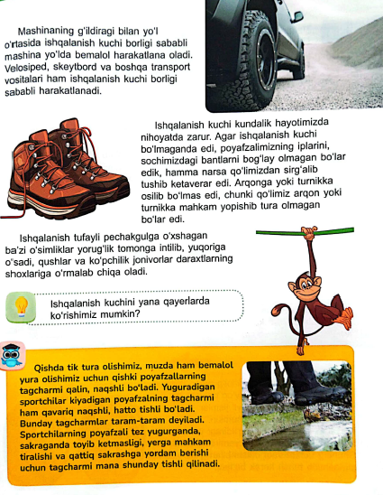 Poyafzalning tagcharmi bilan yer yuzasi o'rtasidagi ishqalanish kuchi tufayli biz bir joyda tura olamiz yoki yura olamiz. Ishqalanish kuchi bo'lmasa, biz yerda tinmay sirpangan yoki sirpanchiq tepalikdan sirpanib yiqilgan bo'lar edik.