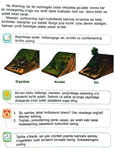 Rasmlarga qarab, kun va tunning, yil fasllarining almashinishini, Quyoshning chiqishi va botishini tushuntirib bering. Bunda sizga oldingi darsda yasalgan Yer maketi qanday yordam beradi? Zilzila, vulqon otilishi va sunami hodisalari Yer qobig'i ostidagi jarayonlarga bogliq bo'lsa, yomg'ir, do‘l va qor esa atmosferadagi jarayonlarga bog'liqdir