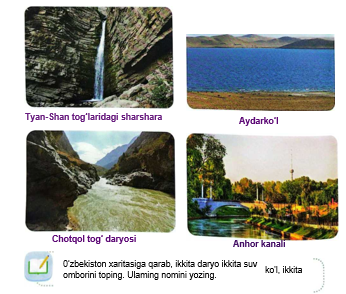 0‘zbekistonning okean va dengizga bevosita chiqish yoli yoq,, shuning uchun vatanimizning asosiy suv manbalari - daryo va ko llardir. 0‘zbekistonning 600 dan ortiq daryo va jilg'alari Tyan-Shan tog tizimidagi muzliklardan boshlanadi. Ularning suvi tog'lardagi cho'qqi va qoyalar orasidan oqib keladi. Shu tufayli tog'li hududlarda nihoyatda chiroyli sharsharalarni uchratish mumkin.